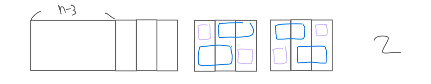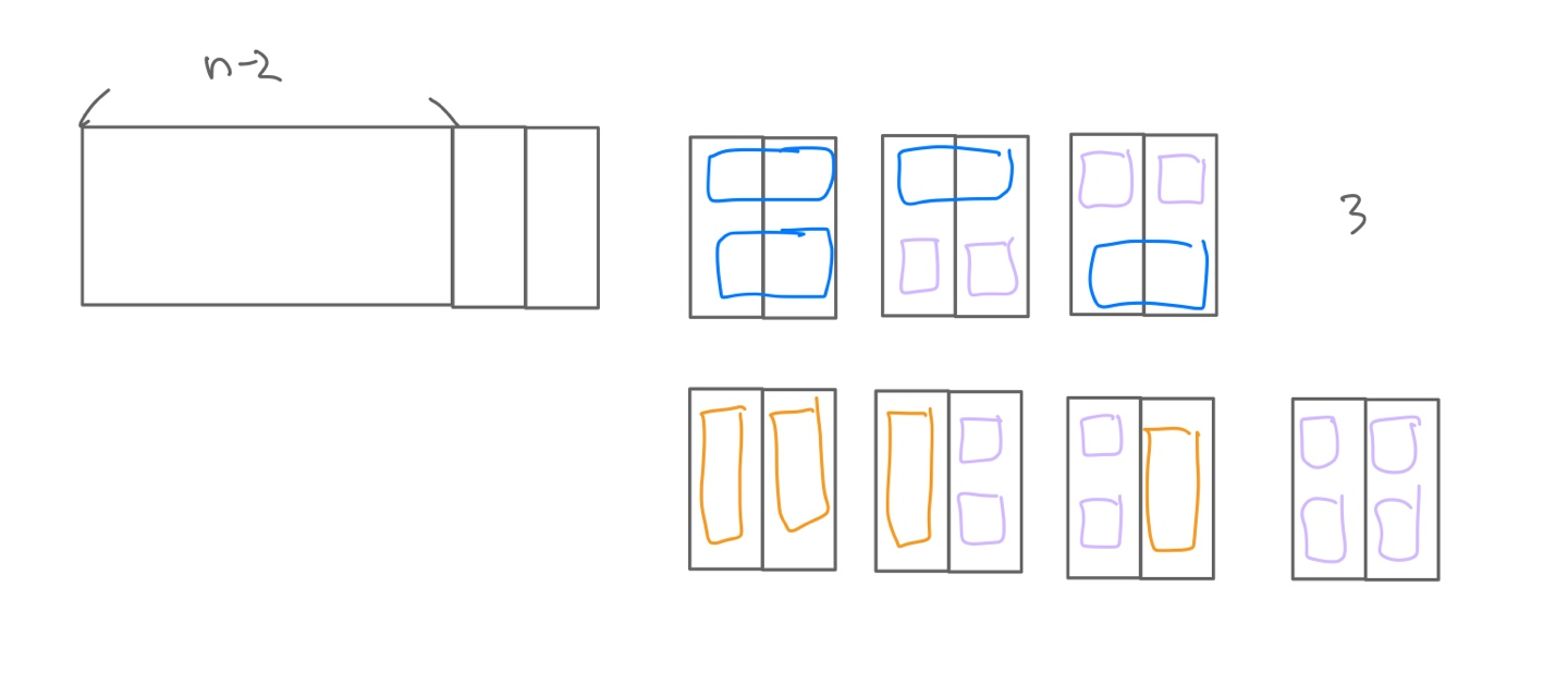 단, 오른쪽 하단 4가지는 n-1에 포함된 경우의 수 이므로 n-2의 고유한 경우의 수는 3가지 입니다.