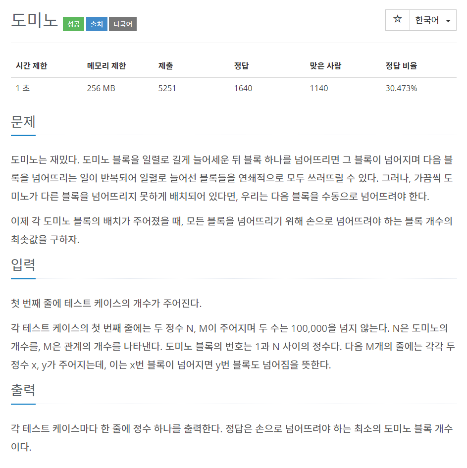 테스트 케이스가 여러개 주어 질 수 있고, 도미노의 개수, 관계의 개수가 100,000 까지 입력될 수 있기 때문에 효율성에 유의합니다.